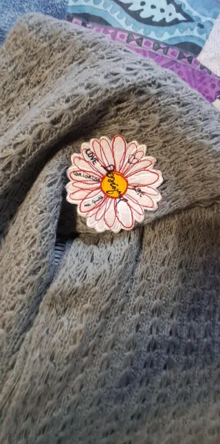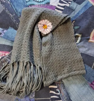 Bufanda de punto fino con un diseño delicado y un detalle de flor. - Tejido suave y ligero. - Diseño calado. - Flecos en los extremos. - Usada 2 veces.