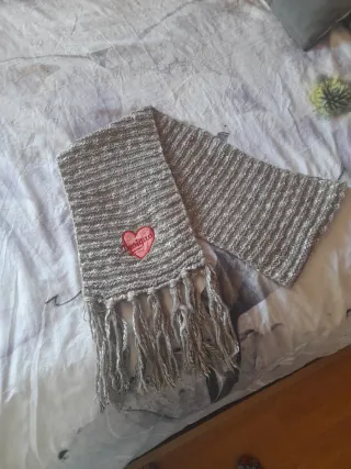 Bufanda de punto con un diseño moderno y detalles únicos. - Parche de corazón rosa bordado. - Flecos en los extremos. - Incluye etiqueta original.