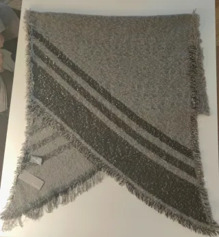 Elegante fular de Parfois. - Diseño con rayas diagonales en tonos grises y plateados. - Corte desigual. - Detalles brillantes que captan la luz. - Acabado con flecos en los bordes.