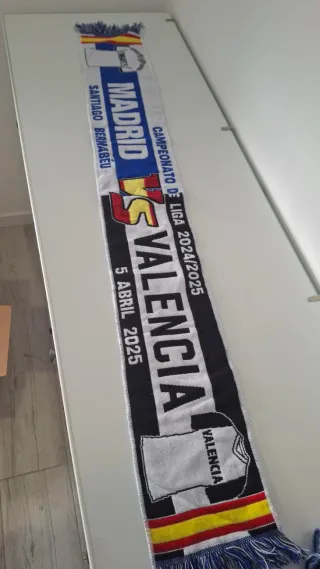 Bufanda conmemorativa del partido entre Real Madrid y Valencia. - Diseño con los escudos de ambos equipos. - Fecha del partido: 5 de abril de 2025. - Incluye la bandera de España en los extremos. - Texto: Campeonato de Liga 2024/2025.