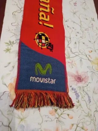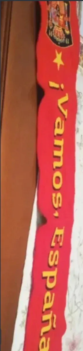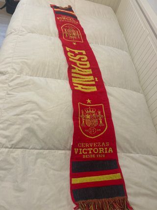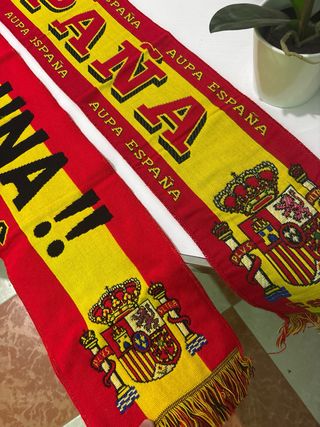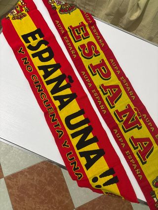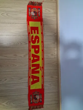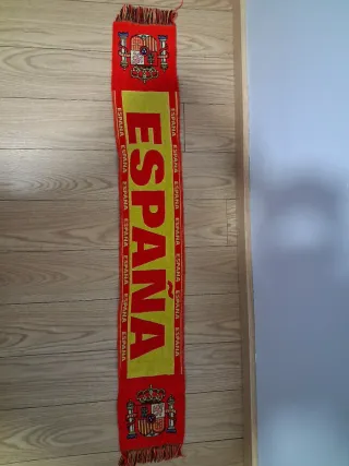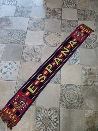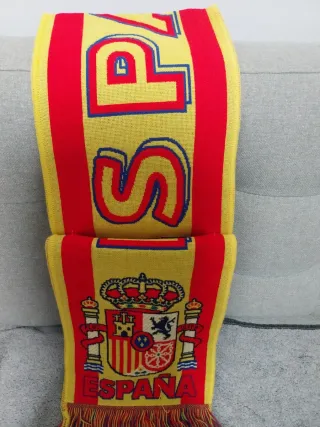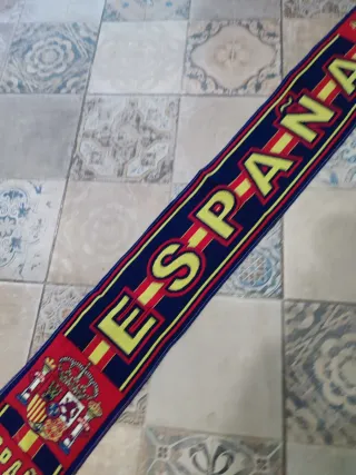 Bufanda con el escudo de España y el lema ¡Vamos, España!. - Diseño con los colores de la bandera española. - Detalle del escudo de España. - Texto ¡Vamos, España! en amarillo. En perfecto estado, entregas en mano en Madrid. Acepto ofertas razonables, Quedamos sin compromiso, la ves y decides.