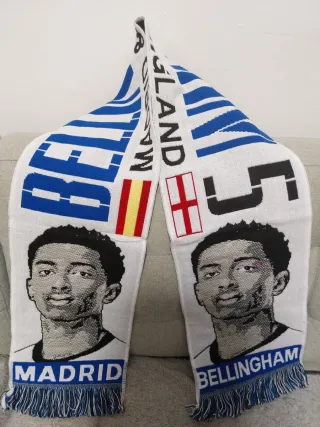 Bufanda del Real Madrid con la imagen de Bellingham. - Diseño tejido en blanco y azul. - Incluye la bandera de España y la de Inglaterra. - Detalle de flecos en la parte inferior.