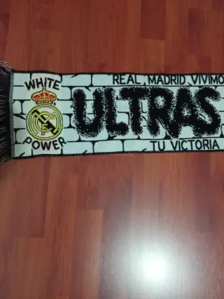 Bufanda vintage de los Ultras Sur del Real Madrid. Un accesorio para verdaderos aficionados. - Diseño con ladrillos blancos. - Incluye el escudo del Real Madrid y la bandera de España. - Texto Ultras Sur, White Power, Real Madrid Vivimos por ti... Vence por nosotros..., Tu Victoria es Nuestra Fuerza..., Real Madrid Supporters.