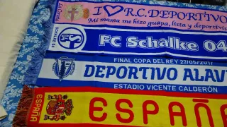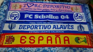 Conjunto de cuatro bufandas de fútbol con diferentes equipos y motivos. - Bufanda del R.C. Deportivo de La Coruña. - Bufanda del FC Schalke 04. - Bufanda del Deportivo Alavés (Final Copa del Rey 2017). - Bufanda de España con motivo del Mundial Brasil 2014.