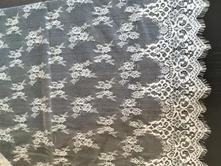Elegante mantilla de encaje Chantilly con un delicado diseño floral y borde festoneado. Por cierre de Tienda Fabricada en España muy suave y muy buena calidad precio en tienda 1.250€
