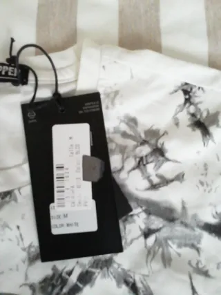 - Foulard de seda con colores neutros y estampado del estadio y escudo del Real Madrid, 30€. - Pañuelo en tonos rosas, azules y naranja, dibujo cachemir 100% viscosa, sin uso 5 € -Pañuelo cuello en magenta y rosas, 40% seda y 69% poliéster, sin uso, 5 € - Pañuelo seda 100%, cosido a mano, tonos azules y rojo, dibujo mujer, 15€ - Pañuelo cuello, lunares en blanco y azul marino, 4 € - Pañuelo en verde, rojo y dorado, dibujo cadenas 100% poliéster, 3€.