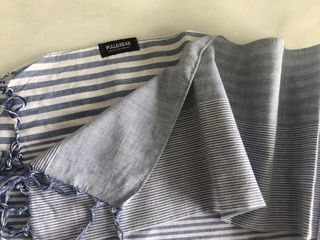 Favorecedor pañuelo de rayas azul claro y blancas de la marca Pull & Bear. Medida: 172 cm. Tiene un estampado de rayas diferente en cada lado (ver fotos), lo que hace que puesto quede genial. Sin uso.