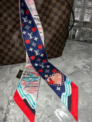 Elegante pañuelo Twilly de Louis Vuitton con un diseño vibrante. - Estampado con corazones y el logo de la marca. - Combinación de colores azul, rojo y blanco. - Detalle de rayas y flores.