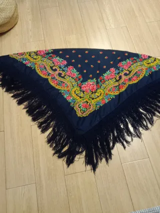 Precioso mantón con un diseño vibrante y lleno de color. Ideal para añadir un toque especial a cualquier atuendo. Mantón cuadrado, medidas lado 90 y flecos 14. - Estampado floral detallado. - Flecos largos y abundantes. - Base azul oscuro.