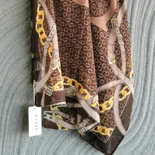 Precioso pañuelo de la marca Guess con un diseño sofisticado que recuerda a los icónicos estampados de casas de lujo como Hermès o Gucci. Presenta el clásico motivo de cadenas doradas, cinturones con hebillas y el logotipo "G" de la marca. Estado: Nuevo con etiqueta. Impecable, nunca se ha usado. Diseño: Estampado "Heritage" en tonos marrones, beige y dorado, una combinación muy elegante y atemporal.