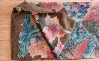 Foulard o chal estampado con hojas otoño. Medida 120 × 120 cm. Tonos verde musgo, tierra, tostados, vino...No tiene etiquetas, no sé el material pero no se arruga y se lava y se seca rápido