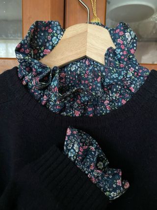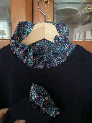 - Cuello falso con volantes. - Puños falsos a juego. - Diseño floral en tonos azules y rosas. Tela con estampado liberty