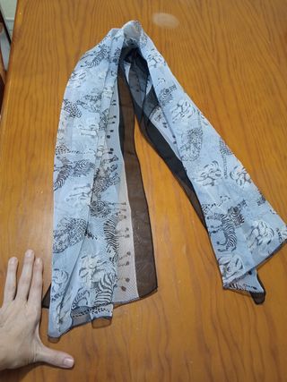 Foulard vintage de gasa con un llamativo estampado de tigre. Su diseño unisex lo hace versátil para cualquier estilo. - Tejido ligero y vaporoso. - Estampado de tigre en tonos marrones y grises.