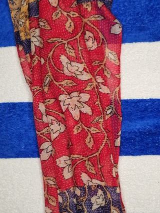Bufanda de algodón con estampado floral. - Diseño con flores y hojas. - Bordes con flecos decorativos. - Combinación de colores vibrantes.