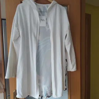 Chaqueta larga con un diseño original que combina letras y un dibujo de una chica con bufanda azul y taza. - Estampado frontal y trasero. - Mangas largas blancas. - Capucha.