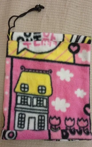 Braga de cuello para niña con un divertido diseño, solo puesta 1 día . Está nueva - Talla única. - Estampado de casa, nubes y flores. - Cierre con cordón ajustable.