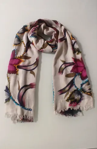 Bufanda con un diseño degradado y estampado. - Tacto suave. - Flecos en los extremos. - Diseño floral abstracto. Como se puede apreciar esta nueva, sin estrenar. Precio un poco negociable