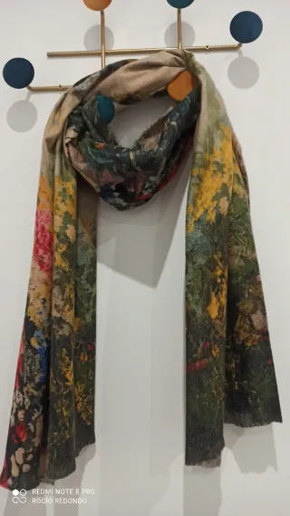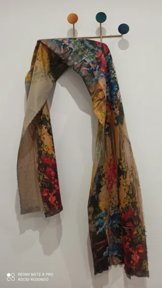 Bufanda con un diseño vibrante y artístico, perfecta para añadir un toque de color a cualquier atuendo. Usada un día - Estampado floral abstracto. - Bordes deshilachados.