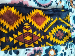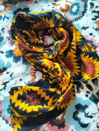 Fular con un llamativo estampado de estilo étnico. - Diseño geométrico con motivos tribales. - Combinación de colores vibrantes sobre fondo oscuro.