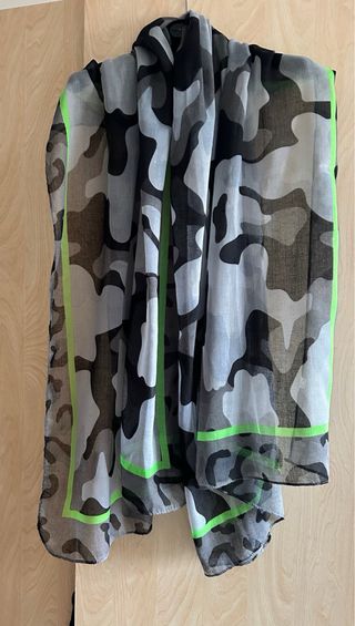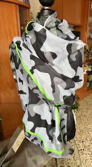 Pañuelo estampado con diseño tipo chal. - Estampado de camuflaje. - Ribete en color verde neón.