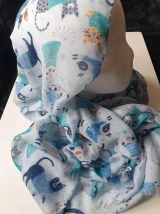 Pañuelo ligero con un divertido estampado de gatos con jerséis y copos de nieve. El color es un poco más azul, la cámara no saca bien el color. Nuevo *Cambio mucho los anuncios, si te gusta algo cómpralo ó resérvalo antes de que lo quite! ;) *No regateos. *VISITA mi perfil,tengo muchas cositas y PUEDES CREAR UN LOTE de envio para pagar un solo coste. *Envio por wallapop o entrego en mano en Zaragoza