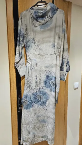 Vestido vaporoso de Zara con un bonito estampado floral. - Diseño ligero y fluido. - Cuello tipo bufanda. - Mangas largas con puños abotonados. - Estampado en tonos beige y azul.
