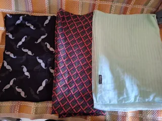6 pañuelos diferentes marcas ( natura, bershka) y diferentes medidas, pero son más o menos grandes: Verde 75cmx2m aprox Bigotes 90x1.10 aprox (es doble) Cuadros lila 95x91 aprox Rombos granate 2x1.80 aprox Azul 55x1.50 aprox Estampado negro 1x1 aprox Los 6 x 6 € El verde clarito tiene un pequeño punto suelto q a penas se aprecia. Algunos están más usados y otros a penas. #pañuelos #ofertas