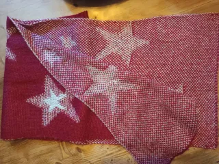 Braga de cuello con un diseño de estrellas. Al doblarlo se ven los 2 tipos de estrellas. Color granate. Estrellas negras. Tejido ligero. En la foto no se ve bien el color pero es granate. Medidas 100x 80 cm. Muy poco uso. Comprado en londres