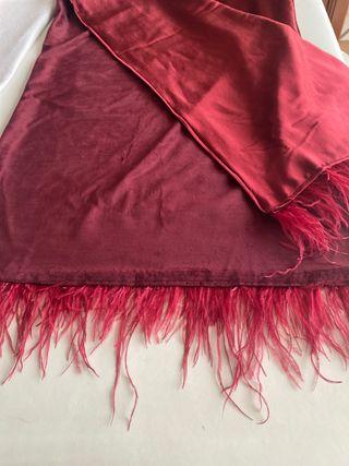 Elegante chal de satén granate con un detalle de plumas en el bajo, perfecto para complementar tu atuendo en ocasiones especiales. - Material principal: satén. - Adorno: plumas. - Diseño ideal para eventos.