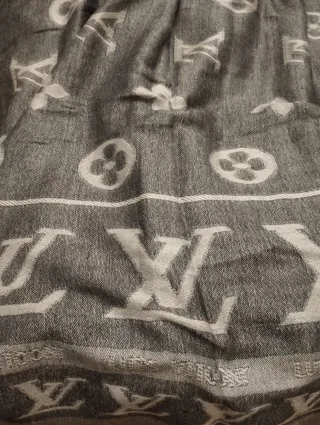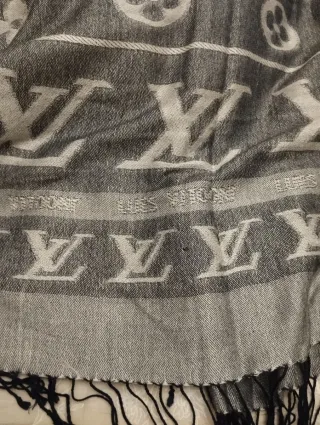 Elegante pasmina con el icónico diseño de LV - Diseño en jacquard con monogramas. - Combinación de colores gris y blanco. - Acabado con flecos.