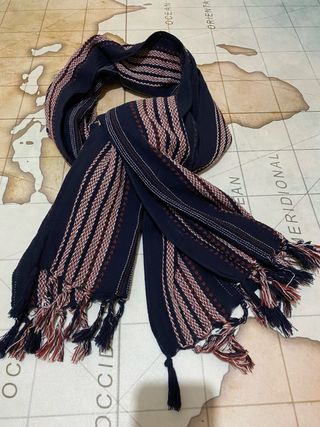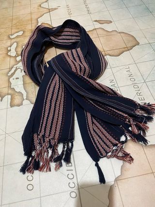 Preciosa Bufanda/Chal de la marca NATURA Estilo Étnico / Boho. Muy favorecedora. Estampado Geométrico de rombos y triángulos en Azul Marino, Burdeos y Blanco. De forma rectangular acabada con flecos en los extremos que le dan mucho movimiento. Tacto suave: Tejido muy agradable y ligero, no pica nada. Súper versátil. Como Bufanda Clásica: Dale un par de vueltas al cuello para un look de invierno acogedor y con estilo. Como Chal/Echarpe: Déjala caer sobre los hombros encima de un vestido o chaqueta; ideal para eventos o noches que refrescan. Medidas: largo 170cm y ancho 52cm.
