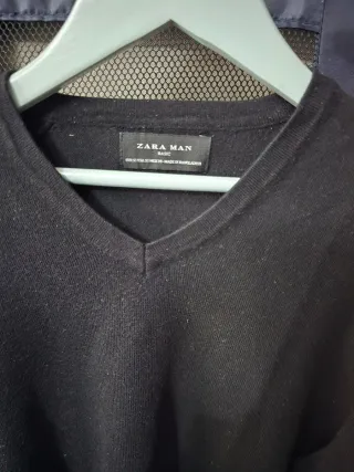 Conjunto de prendas de vestir para hombre. Cuello alto Primark talla S, jersey negro zara talla s , Blazer pone talla L ma viste como S/M - Chaqueta negra. - Jersey de cuello alto beige. - Jersey de pico negro. - Bufanda negra con detalle plateado.