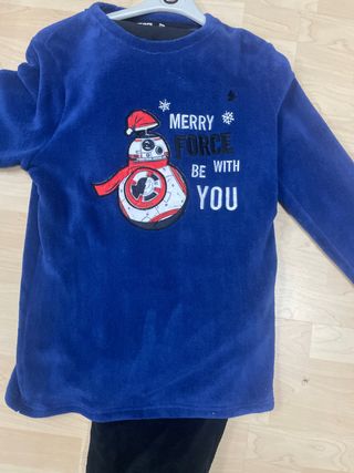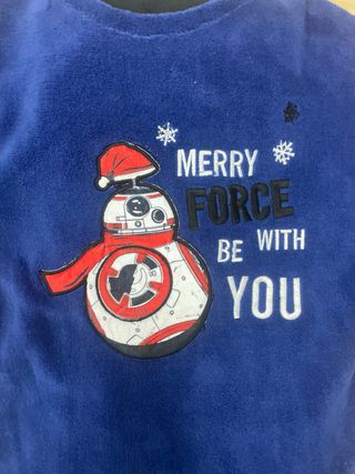 Pijama de Star Wars para hombre con un divertido diseño de BB-8 navideño. - Tejido suave y cómodo. - Estampado de BB-8 con gorro de Papá Noel y bufanda. - Mensaje Merry Force Be With You.