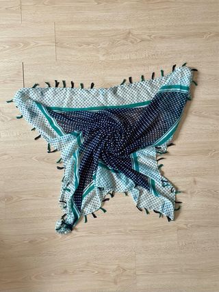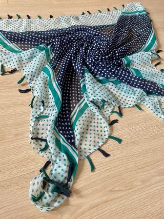 🧣 Pañuelo cuadrangular de 110 × 110 cm, con un bonito estampado de lunares en tonos verde, blanco y azul, una combinación fresca y muy fácil de llevar. Los flecos en los extremos le aportan movimiento y un toque artesanal muy especial. ✨ Es una pieza de marca local, fabricada en España, cuidada en los detalles y con un diseño atemporal. Gracias a su tamaño, puede doblarse en forma de triángulo y colocarse al cuello, sobre los hombros o incluso como complemento para bolsos. 🍃 Ideal para esta época del año, ya que abriga y sienta fenomenal tanto con looks casuales como con conjuntos más arreglados.