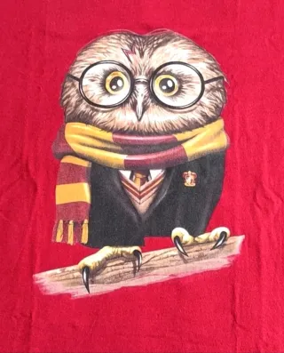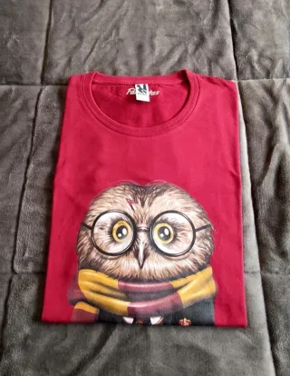 Camiseta recta de color burdeos, con impresión de Hedwid con bufanda de Gryffindor. Talla XL. Nueva. 100% algodón. Medidas en fotos.