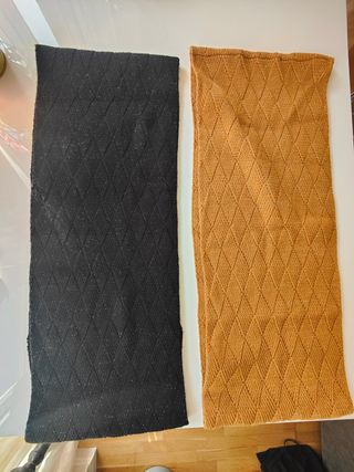 Dos bufandas cuello infinito de punto. Una es amarilla con hilos dorados y la otra negra con hilos plateados. Nunca han sido usadas.