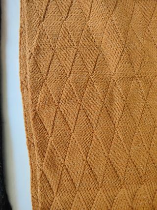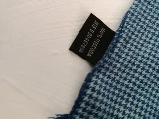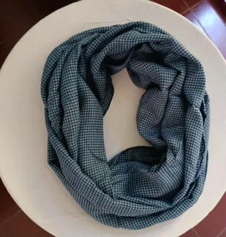 Preciosa y calentita bufanda infinita, también llamada loop o cuello. Apenas la he usado dos veces. Aún huele a tienda :-D Mide 34 cm2. Tacto de lana, superamoroso, aunque es 80 € acrílico y 40 € poliéster. Azul tejido con ochos por fuera, estampado de cuadros por dentro.