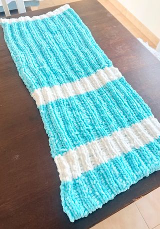 Bufanda artesanal de punto en formato infinito o loop. Combina tonos azules y blancos creando un diseño a rayas. - Tejido suave y cálido. - Diseño a rayas. - Estilo moderno y versátil.