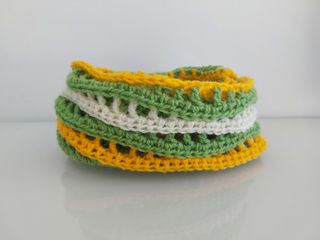 Bufanda infinita nuevo, doble vuelta en color verde, amarillo y blanco. Hecho a mano a crochet, idea regalo. Compleméntalo con algún otro articulo de mi perfil y ahorra en el envío con un lote! Puedes ver mi trabajo en instagram: @nuria_marine (PetiLo). #PetiLo #PetiLoBufanda #PetiLoLana