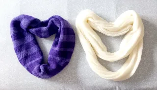 Conjunto de dos bufandas de cuello tipo infinito, nuevas y listas para usar. - Bufanda de punto en tonos morados y lilas. - Bufanda de punto en color blanco roto.