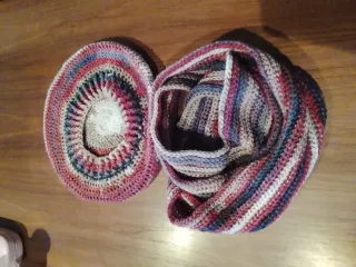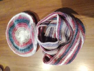 Conjunto de boina y bufanda infinita, ambas tejidas a mano con ganchillo. - Diseño artesanal. - Hilos de múltiples colores.