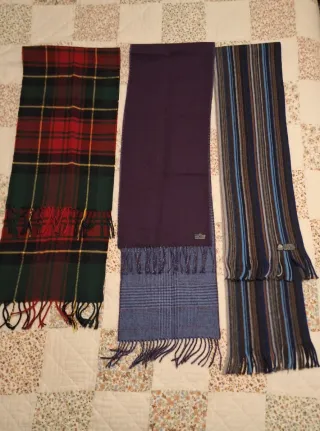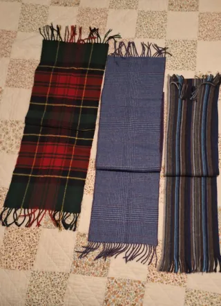 Conjunto de tres bufandas de lana con diferentes diseños. - Bufanda de cuadros tartán en rojo, verde y amarillo. - Bufanda de cuadros príncipe de gales en azul. - Bufanda de rayas verticales en tonos azules, marrones y grises.