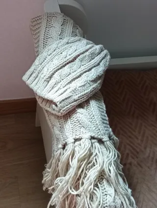 Se venden dos bufandas de gran tamaño, una en color marrón y otra en blanco. Son ideales para abrigarse. - Bufanda de lana con flecos. - Bufanda de punto grueso.