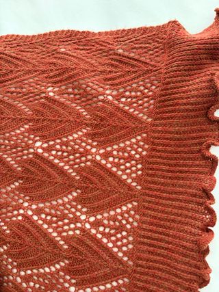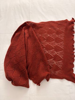 Bufanda de lana con un diseño intrincado y un borde festoneado. Muy calentita Medidas largo 2 metros x ancho 50 cm - Tejido de lana. - Diseño de hojas caladas. - Borde con volantes.
