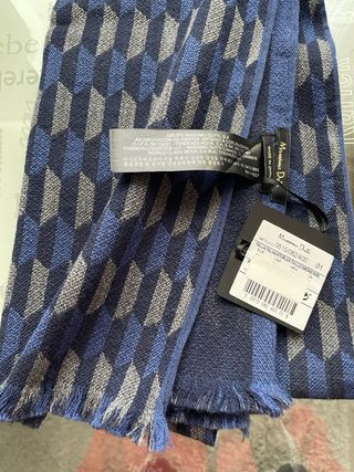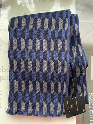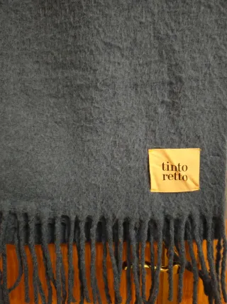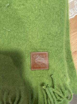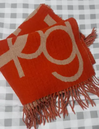 Bufanda de lana suave con un diseño moderno. Tiene una mancha, de ahi el precio - Parche de cuero con el logo de la marca. - Acabado con flecos.