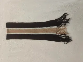 Bufanda de lana con un diseño de rayas. - Material: Lana - Diseño: Rayas verticales - Colores: Marrón y blanco