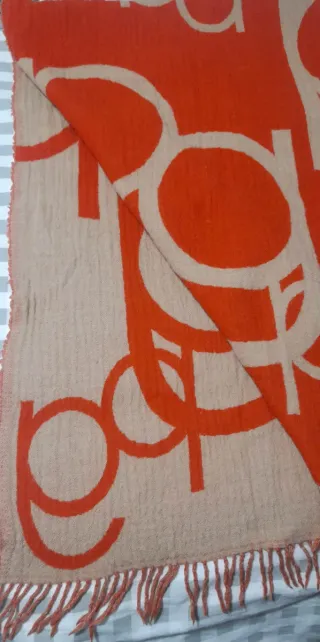 Bufanda de lana con un diseño llamativo. - Hecha de lana 100%. - Color naranja con estampado. - Con flecos en los bordes.
