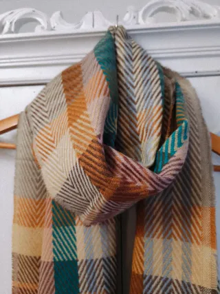 Bufanda de lana con un diseño de cuadros en tonos cálidos y fríos. Perfecta para añadir un toque de color a cualquier atuendo. - Diseño a cuadros - Acabado con flecos Sin marca
