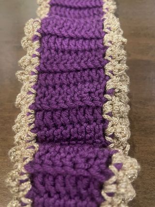 Bufanda tejida a mano 🧶 con un diseño elegante. Lana merino🐑 125 cm - Color berenjena. - Borde decorativo en hilo dorado brillante que la da luz. - Textura acanalada en el centro.