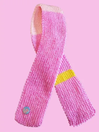 Bufanda artesanal tejida por mí de punto con una divertida chapa de The Pink Panther. - Tejido suave y cálido. - Detalle de chapa de la Pantera Rosa. - Color rosa con tiras de color amarillo.